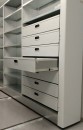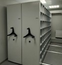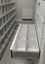 Мы установили передвижные стеллажи серии Т, с нагрузкой на полку до 80 кг и адаптировали их внутреннее содержание под хранимое. Одну секцию стеллажа сделали с оцинкованными полками, для повышения их прочности при ежедневной работе, и выдвижными ящиками с разделителями для мелких деталей. Остальные секции сделали ячеистого формата для адресного хранения.