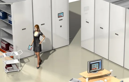 Применение мобильных стеллажей с электронным управлением позволяет увеличить в 2 раза вместимость при сохранении прежней площади или уменьшить в 2 раза площадь, занятую архивом или складом, при сохранении объема хранимых товаров и документов.