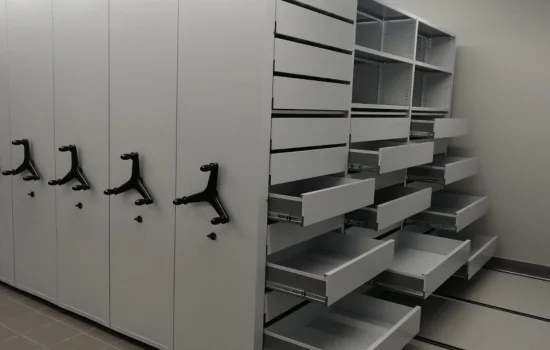 Стеллажи с электроприводом серии «Актив» оборудованы ящиками для хранения CD или картотеки