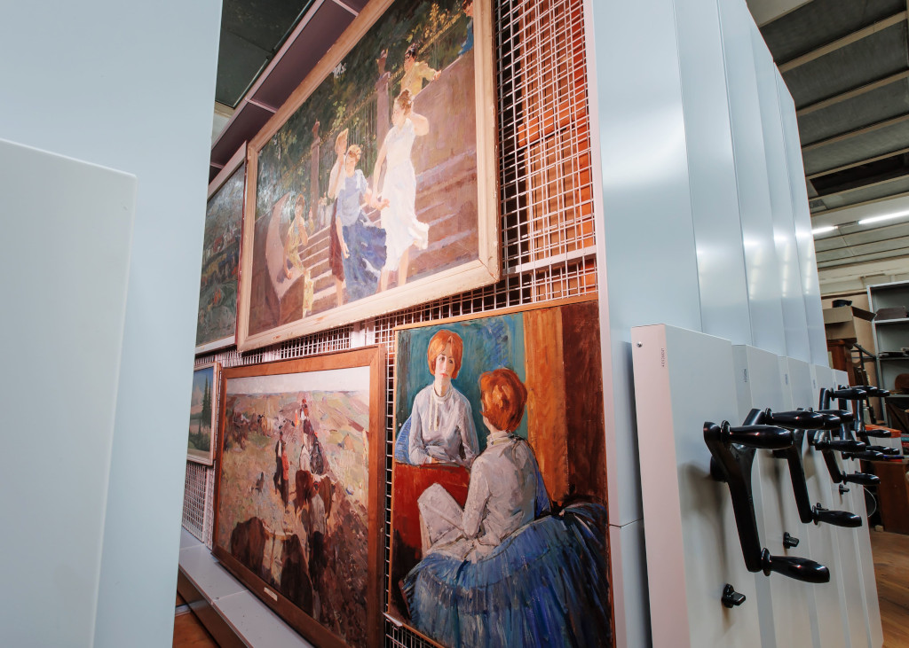 Раздвижные стеллажи с сетками - это удобная система хранения картин в фондохранилище музея, которая позволяет защитить их от пыли, грязи и повреждений и сэкономить площади.
