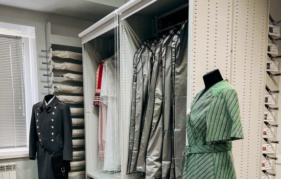 Фондовый стеллаж для хранения текстильных изделий и образцов тканей в музее.